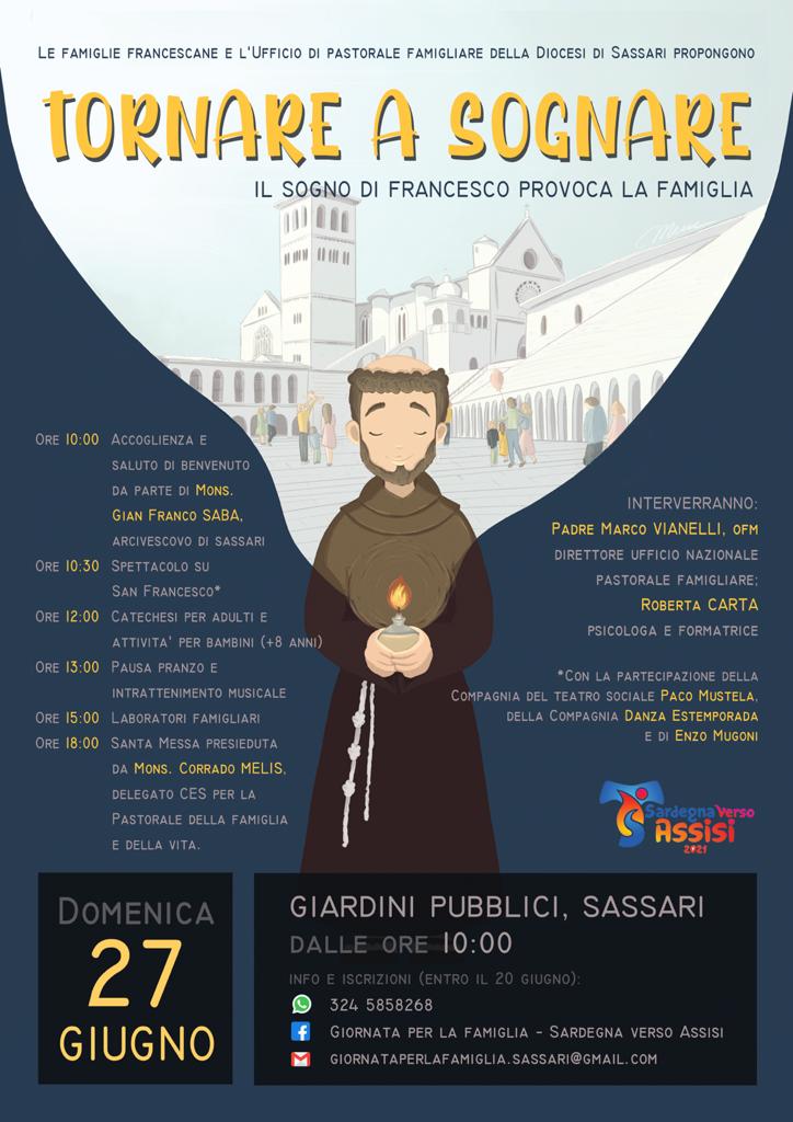 Domenica 27 giugno p.v. la nostra Associazione sarà presente all’evento per le famiglie organizzato dai francescani unitamente all’Arcidiocesi di Sassari per tutte le famiglie del Nord Sardegna. L’incontro di carattere regionale dal titolo “Tornare a sognare. Il sogno di Francesco provoca la famiglia” si svolgerà all’aperto nei giardini pubblici della città di Sassari. Tra le varie personalità presenti ci saranno l’arcivescovo di Sassari mons. Gianfranco Saba, il vescovo delegato CES per la Famiglia, mons. Corrado Melis e il direttore dell’Ufficio Nazionale per la Famiglia fr. Marco Vianelli.