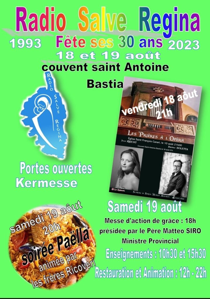 Nella chiesa del convento cappuccino di sant’Antonio da Padova a Bastia in Corsica il 19 agosto 2023 si è tenuta una conferenza per l’anniversario della Radio Salve Regina: la prima e unica radio cattolica in Corsica, fondata appunto nel 1993, cioè 30 anni fa.