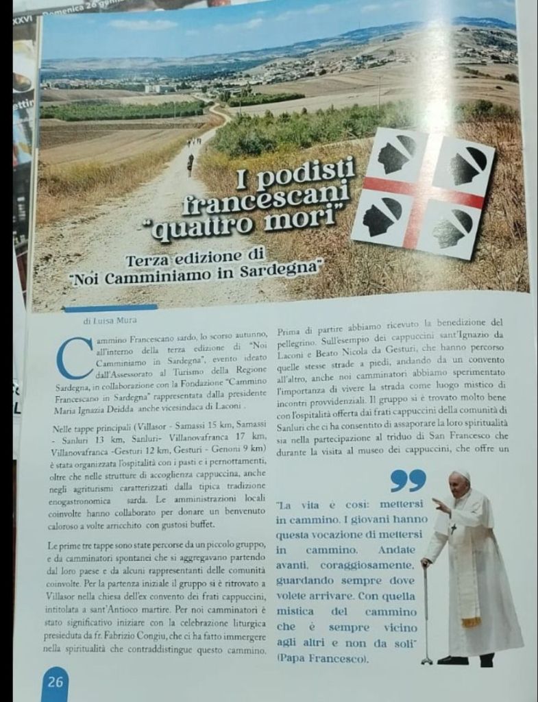 La rassegna stampa è ricca ma partiamo dal primo articolo che rappresenta la prima parte di un reportage di una giornalista, Maria Carrozza, che si è unita al gruppo dei camminatori a Sanluri fino a Villanovafranca ( foto alla fine dell’articolo) che ha camminato insieme a noi da Gesturi (foto in evidenza sopra) fino alla fine del Cammino a Genoni.
