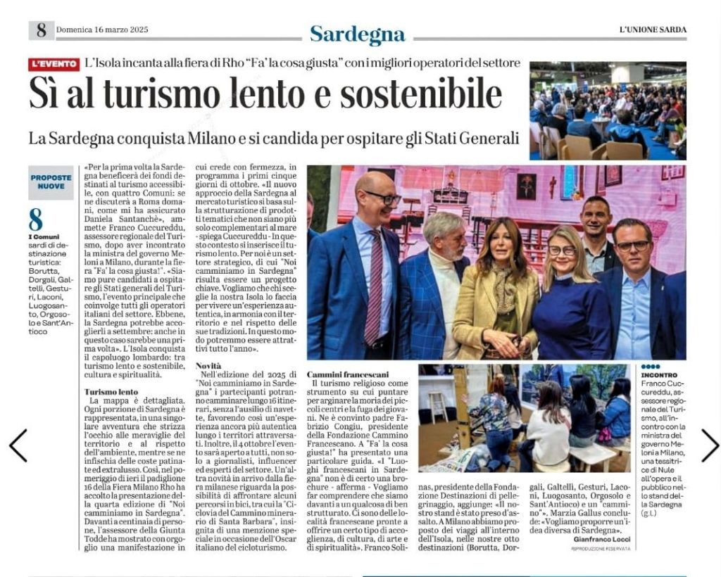 Articolo dell’Unione Sarda dal titolo “Milano, la Sardegna conquista la fiera dedicata al turismo sostenibile”.
