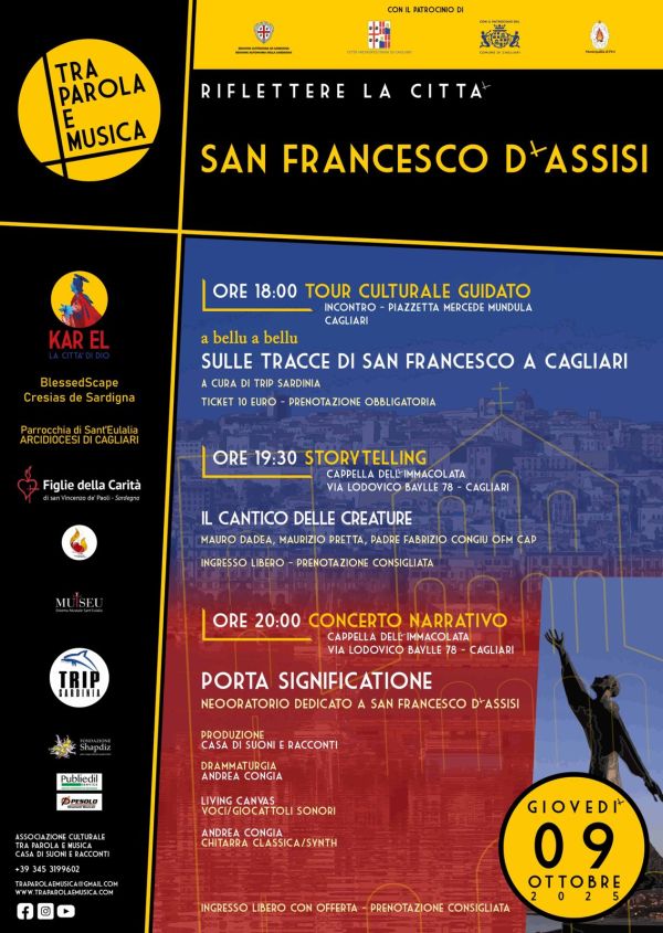 Luisa Mura 8 ottobre 2025 L'Associazione partecipa all'incontro su San Francesco d'Assisi a Cagliari il 9 ottobre. In particolare sarà disponibile sul nostro Canale YouTube il video dell'intervento di Fr. Fabrizio Congiu ofmcap sul Cantico delle Creature alle ore 19.30 in via Bayle 78 nella Cappella dell'Immacolata. https://youtu.be/5Z5a5MjcuDI Per i dettagli consultare la locandina. Ricordi... Continua a leggere →