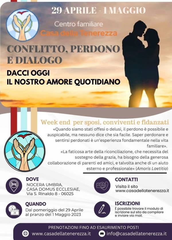 L'Associazione promuove gli incontri del Centro Familiare Casa della Tenerezza di Perugia, per questo vi invitiamo a partecipare ad un week end per coppie... Per iscriversi i contatti sono nella Locandina.