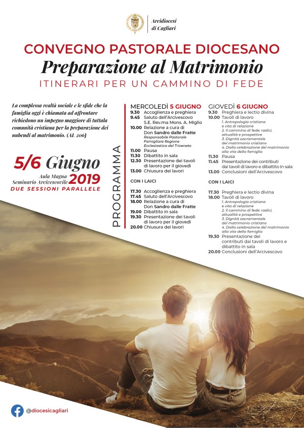 L'annuale convegno pastorale diocesano si terrà il 5 e il 6 giugno, presso l’Aula magna del Seminario arcivescovile di Cagliari. Il tema di quest'anno: itinerari di preparazione al sacramento del matrimonio. Si terranno due sessioni parallele, al mattino per i sacerdoti/religiosi e al pomeriggio per i laici. Le relazioni saranno tenute da Don Sandro dalle... Continua a leggere →